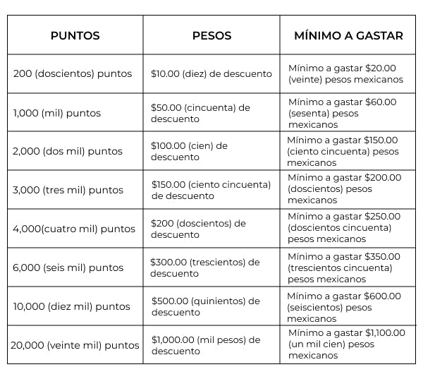 - Por Referencia: los miembros recibirán 2,500 (dos mil quinientos) puntos por cada amigo referido que realice una compra. Los amigos referidos recibirán un 15% (quince por ciento) de descuento en su primera compra, sujeto a un gasto mínimo de $2,500 (dos mil quinientos 00/100 MN) mismo que tendrá una vigencia de 30 (treinta) días naturales contados a partir de la fecha en la que fue referido. Los puntos adicionales por referencia se limitan únicamente a 10 (diez) referencias.