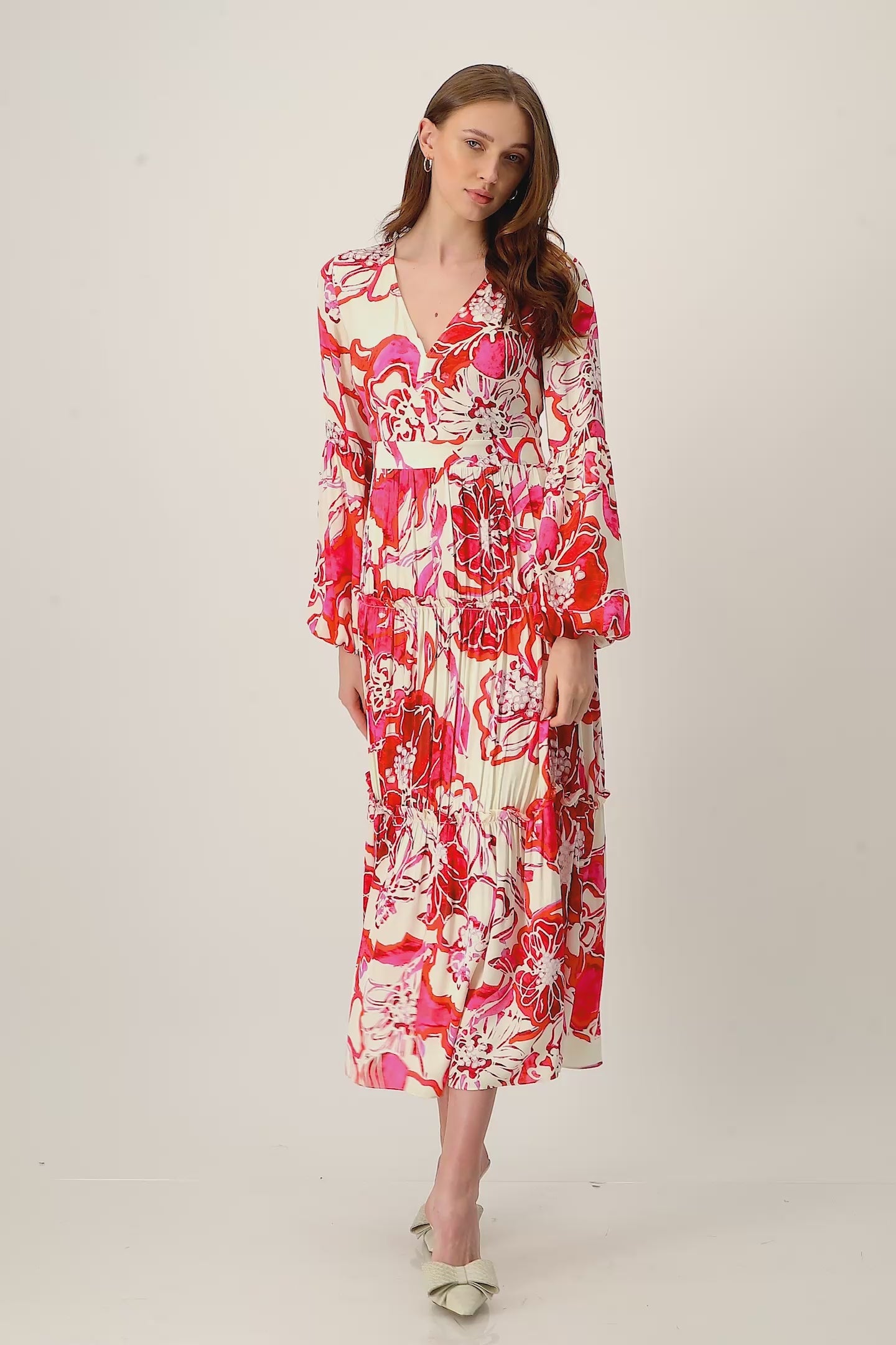Maxi vestido fucsia con manga abullonada, escote en V y estampado floral, silueta suelta con cintura definida.